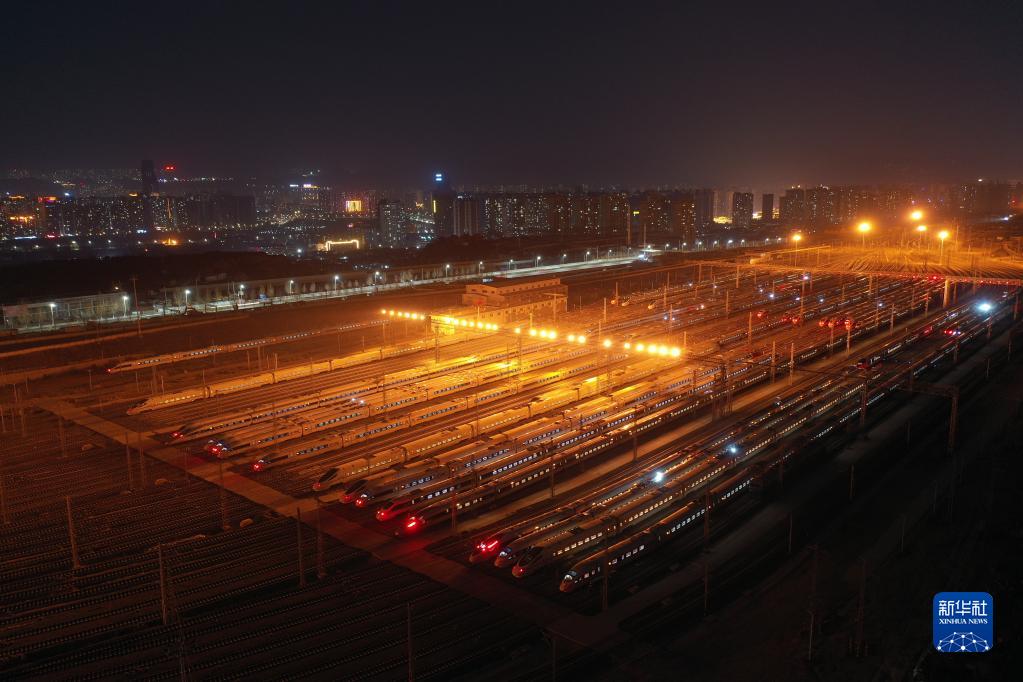 1月16日晚,動(dòng)車組列車??吭谥袊F路蘭州局集團(tuán)有限公司蘭州車輛段蘭州西動(dòng)車運(yùn)用所整備場上,為1月17日開始的2022年春運(yùn)做好準(zhǔn)備(無人機(jī)照片)。新華社記者 杜哲宇 攝