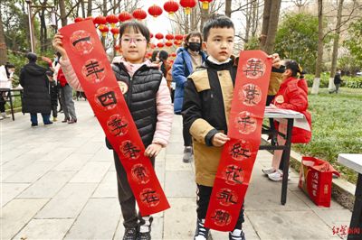 原標(biāo)題:小小書(shū)法家人民公園送春聯(lián)
