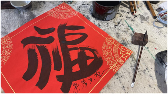 人民網(wǎng)上海1月27日電(王文娟)“寫下這581個創(chuàng)意福字,希望新年新氣象,福到每一家?!?7日,綿綿細(xì)雨中夾帶著些許寒意,在上海市青浦區(qū)朱家角林家藝術(shù)村朱者赤的工作室里,卻洋溢著暖心的氣氛。朱者赤正將書寫多日的“?!弊?,送給“美麗鄉(xiāng)村”的村民們。