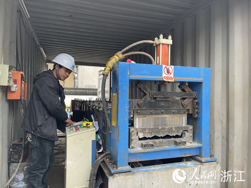 令狐偉偉正在操作機器壓制金屬屋面板。人民網 王蕭蕭攝