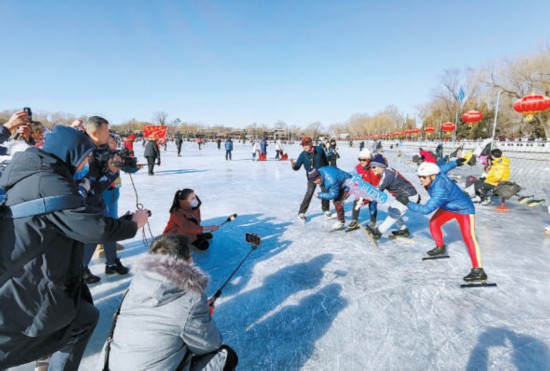 “雙奧之城新氣象——2022中外媒體北京行”走進(jìn)什剎海冰場(chǎng)深入體驗(yàn)老北京冰雪趣味運(yùn)動(dòng)。本報(bào)記者 吳鏑攝