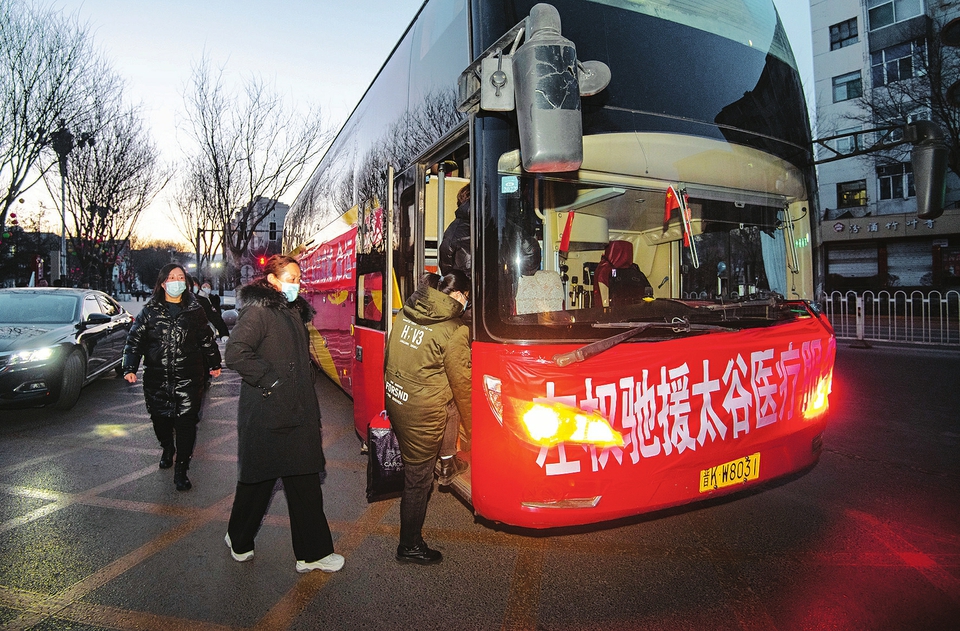 2月22日,左權(quán)縣馳援太谷區(qū)核酸采樣服務(wù)隊(duì)醫(yī)護(hù)人員乘專車赴太谷開展核酸檢測采樣工作。這是繼2月20日,該縣派出的第三批援谷醫(yī)護(hù)人員。(張文軍攝)