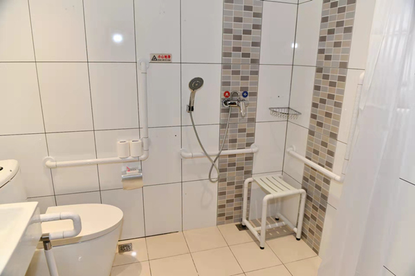 酒店前臺設置了低位服務臺,坐著就可以辦理入住登記等手續(xù)。進入電梯后,電梯按鈕上附有盲文,方便視力障礙人士使用;鏡面、扶手、語音播報一應俱全。來到客房部,走廊平整開闊,鋪設了防滑地膠,客房的房門也進行了拓寬。進入客房內,低位開關、無障礙寫字桌、開放式衣柜等,讓人感覺溫暖、舒適。衛(wèi)生間里配備了各類無障礙設施,淋浴區(qū)一側的墻壁上裝有無障礙扶手,并配備了無障礙淋浴椅和寬大的浴室鏡等。低位洗手盆旁邊,是低位置物架,上面放著擦手巾。