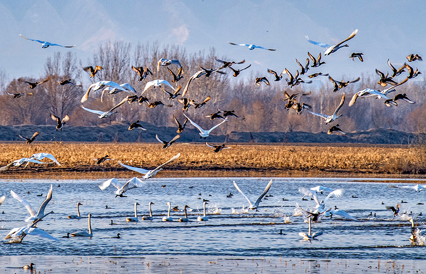 隨著天氣漸暖,棲息在山西省運城市萬榮縣黃河濕地越冬的白天鵝十分活躍,它們在濕地或飛翔、或覓食、或嬉戲,為一年一度的遷徙做準備,吸引眾多游客前來觀賞。