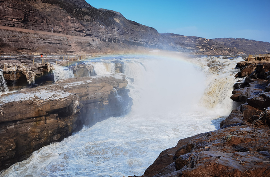隨著氣溫回暖,冰凌融化,黃河壺口瀑布水量增大。飛流直下的瀑布激起大片水霧,在陽光的照射下,瀑布上方出現(xiàn)了一道美麗的彩虹,呈現(xiàn)“彩虹飛渡”的奇觀。(譚飛 攝)