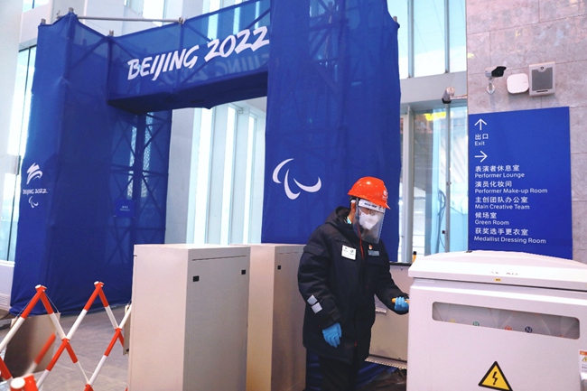 國網(wǎng)北京頒獎(jiǎng)廣場電力保障團(tuán)隊(duì)成員在延慶冬殘奧頒獎(jiǎng)廣場巡視舞臺(tái)區(qū)設(shè)備,確保頒獎(jiǎng)儀式供電可靠。張博寧攝