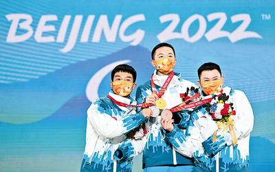 3月7日,北京冬殘奧會(huì)殘奧單板滑雪男子障礙追逐UL級(jí)比賽在云頂滑雪公園舉行,三位來自河北的“零零后”選手紀(jì)立家、王鵬耀、朱永鋼分獲金、銀、銅牌,取得了我國(guó)、河北省在冬殘奧會(huì)該項(xiàng)目的歷史性突破。當(dāng)晚該項(xiàng)目的頒獎(jiǎng)儀式上,3面五星紅旗同時(shí)升起,激動(dòng)人心。