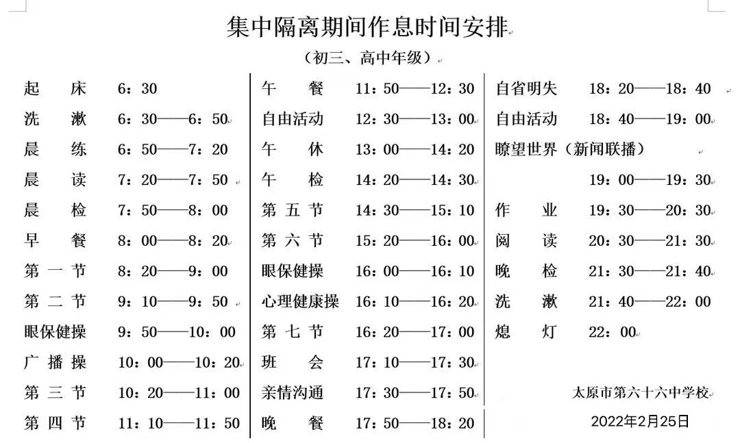 六十六中位于太原市尖草坪區(qū)迎新街迎新東二條,有兩棟教學(xué)樓,分別為初中部與高中部,是一所完全中學(xué)。為了最大程度保證正常教學(xué)秩序,學(xué)校在當(dāng)天就開始制定作息時(shí)間表,根據(jù)學(xué)生不同年齡段的特點(diǎn),分年級(jí)安排部署了隔離期間師生的學(xué)習(xí)與生活。