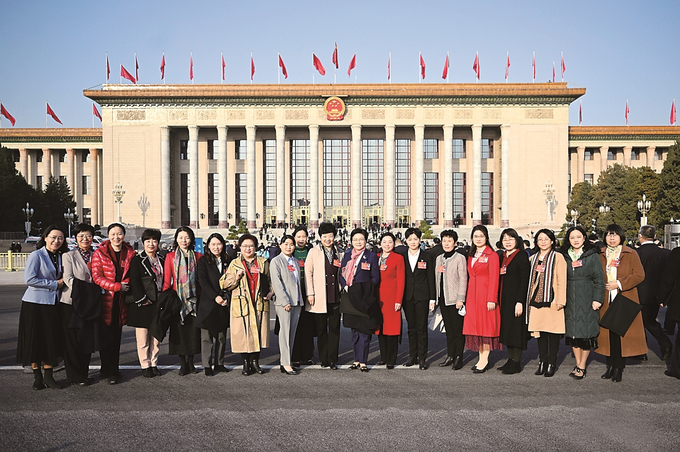 3月8日上午,出席十三屆全國(guó)人大五次會(huì)議的江蘇團(tuán)女代表在人民大會(huì)堂前合影留念,共慶“三八”國(guó)際勞動(dòng)?jì)D女節(jié)。 本報(bào)記者 吳勝 攝