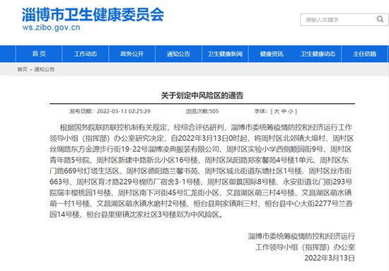 人民網(wǎng)淄博3月13日電(鄭浦麗)據(jù)淄博市衛(wèi)生健康委員會(huì)官網(wǎng)消息,根據(jù)國(guó)務(wù)院聯(lián)防聯(lián)控機(jī)制有關(guān)規(guī)定,經(jīng)綜合評(píng)估研判,淄博市委統(tǒng)籌疫情防控和經(jīng)濟(jì)運(yùn)行工作領(lǐng)導(dǎo)小組(指揮部)辦公室研究決定,自2022年3月13日0時(shí)起,將周村區(qū)北郊鎮(zhèn)大埠村、周村區(qū)絲綢路東方金源步行街19-22號(hào)淄博凌典服裝有限公司、周村區(qū)實(shí)驗(yàn)小學(xué)西側(cè)順園街9號(hào)、周村區(qū)青年路5號(hào)院、周村區(qū)新建中路新北小區(qū)16號(hào)樓、周村區(qū)鳳陽(yáng)路鄭家馨苑4號(hào)樓1單元、周村區(qū)東門路669號(hào)燈塔生活區(qū)、周村區(qū)德陽(yáng)路蘭馨書苑、周村區(qū)城北街道東塘社區(qū)1號(hào)樓、周村區(qū)絲市街663號(hào)、周村區(qū)育才路229號(hào)棉紡廠宿舍3-1號(hào)樓、周村區(qū)御景國(guó)際8號(hào)樓、永安街道北門街293號(hào)院瑞豐櫻桃園1號(hào)樓、周村區(qū)南下河街45號(hào)匯龍街小區(qū)、文昌湖區(qū)萌三村4號(hào)樓、文昌湖區(qū)萌水鎮(zhèn)萌一村1號(hào)樓、文昌湖區(qū)萌水鎮(zhèn)水磨村2號(hào)樓、桓臺(tái)縣荊家鎮(zhèn)荊三村、桓臺(tái)縣中心大街2277號(hào)蘭香園14號(hào)樓、桓臺(tái)縣果里鎮(zhèn)沈家社區(qū)3號(hào)樓劃為中風(fēng)險(xiǎn)區(qū)。