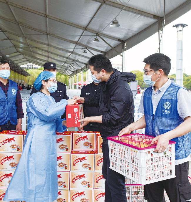 3月17日,志愿者給金華市金東區(qū)方艙核酸采樣站抗疫一線醫(yī)護(hù)人員、公安民警,送去水果、八寶粥、草帽等價值5000余元的物資。金東區(qū)方艙核酸采樣站有120多名工作人員,24小時為市民進(jìn)行免費核酸采樣。(李建林)