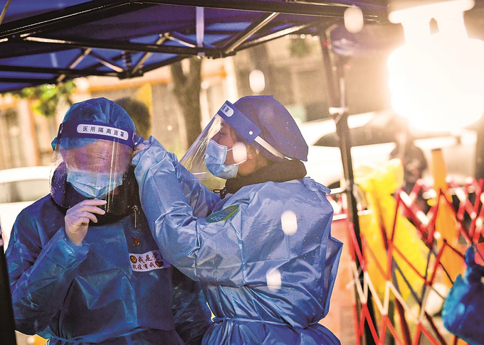 3月20日,南京雨花臺(tái)區(qū)梅欣西區(qū)廣場(chǎng)核酸檢測(cè)采樣點(diǎn),雨中堅(jiān)守的志愿者互相整理起霧的防疫裝備。 本報(bào)記者 萬程鵬 攝