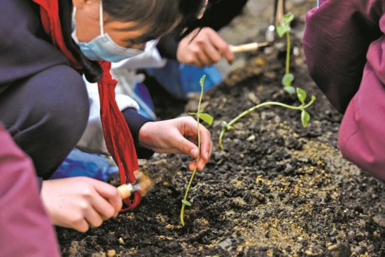 3月23日,嘉興一學(xué)校種植園,學(xué)生們?cè)诟靼嗟摹柏?zé)任田”里忙著種植各種蔬菜和花卉。學(xué)校希望通過豐富多彩的種植活動(dòng),讓孩子們?cè)谟H近植物、探究植物的過程中,提升綜合探究學(xué)習(xí)能力,同時(shí)也更好地推進(jìn)學(xué)?!半p減”政策的落地。(馮玉坤)