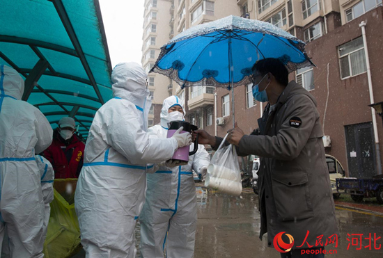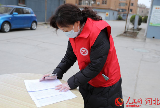 河間市的志愿者身穿紅馬甲在防控一線提供志愿服務(wù)。 李世文攝