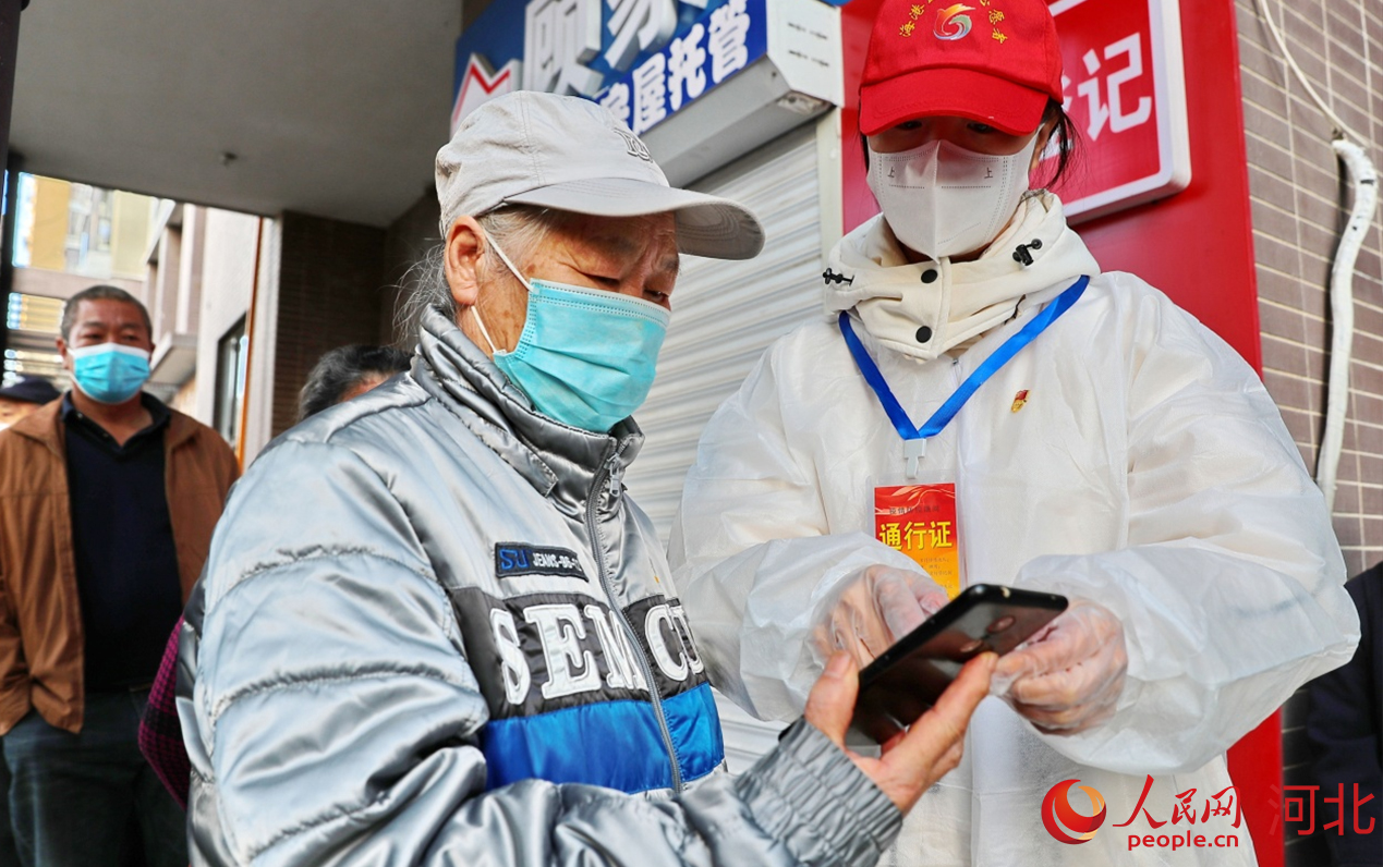 3月26日,在秦皇島市海港區(qū)白塔嶺街道森林逸城社區(qū)內,黨員志愿者指導居民使用電子健康卡。 曹建雄攝