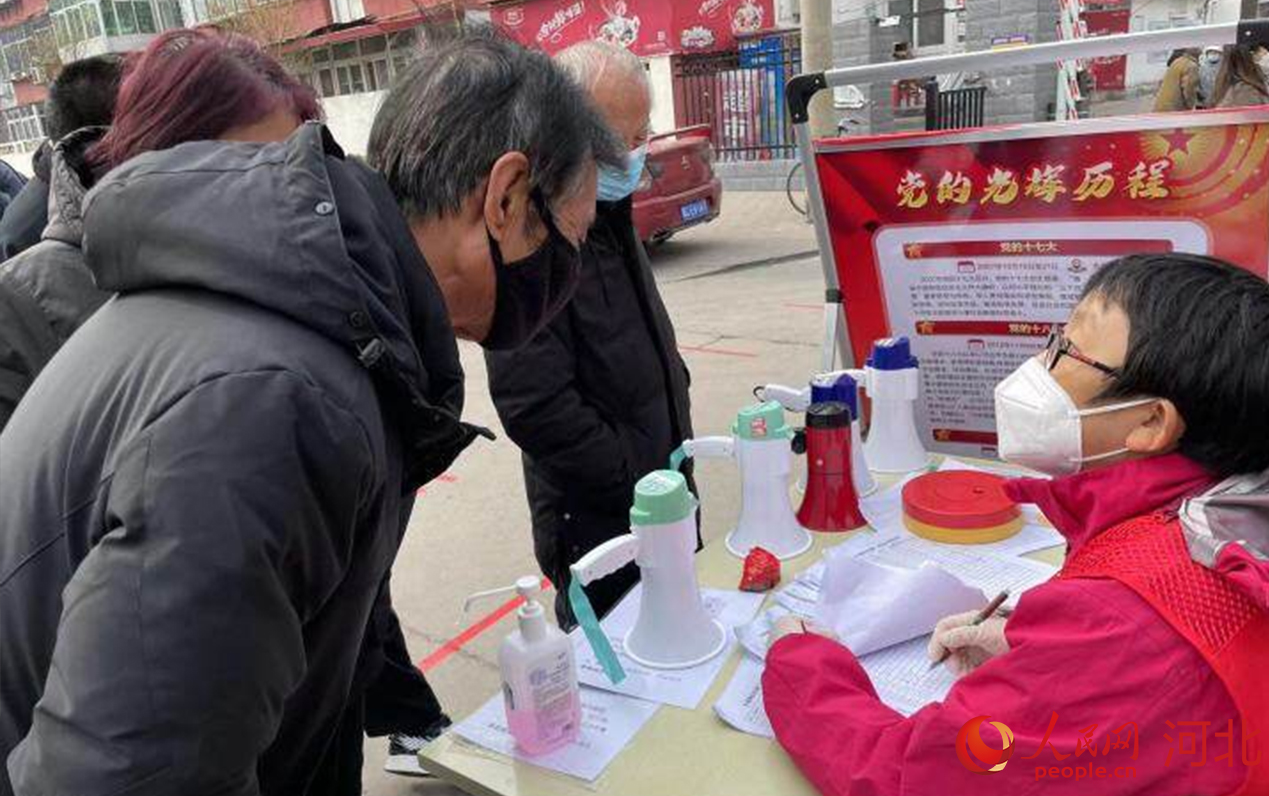 3月26日,在秦皇島市海港區(qū)白塔嶺街道秦皇半島第二社區(qū)內,黨員志愿者正在維持現(xiàn)場秩序。 曹建雄攝
