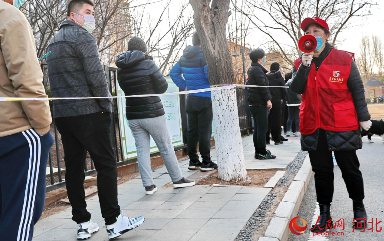 人民網(wǎng)石家莊3月27日電 “打開電子健康碼?!薄氨3趾?米距離?!薄?月25日上午9點,在河北秦皇島市海港區(qū)森林逸城小區(qū),秦皇島市委組織部黨員先鋒隊隊員董菁正在組織居民有序排隊做核酸檢測,提醒大家準備好電子健康碼,耐心指導不熟悉操作流程的居民。