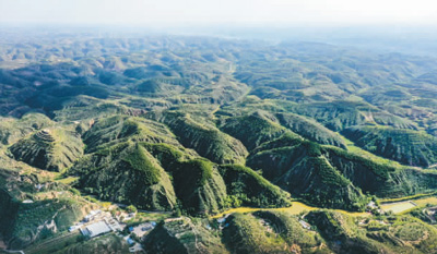 黃土溝壑中的陜西榆林市米脂縣銀州街道高西溝村滿眼綠色(無(wú)人機(jī)照片)。
