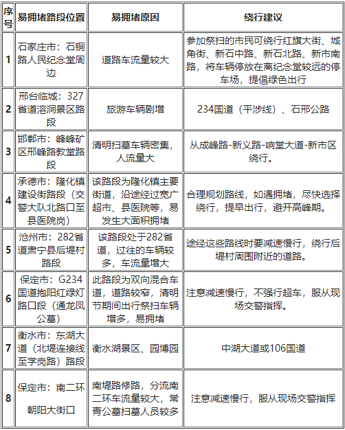 清明假期河北省8處易交通擁堵路段