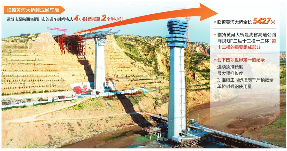 臨猗黃河大橋是連接晉陜最長的黃河公路大橋,全長5427米,主橋采用等高度連續(xù)鋼箱組合梁,從山西、陜西兩處頂推平臺對向頂推,這也創(chuàng)下連續(xù)頂推長度、最大頂推長度、頂推施工同步控制千斤頂數量以及單橋耐候鋼使用量四項世界第一的紀錄。