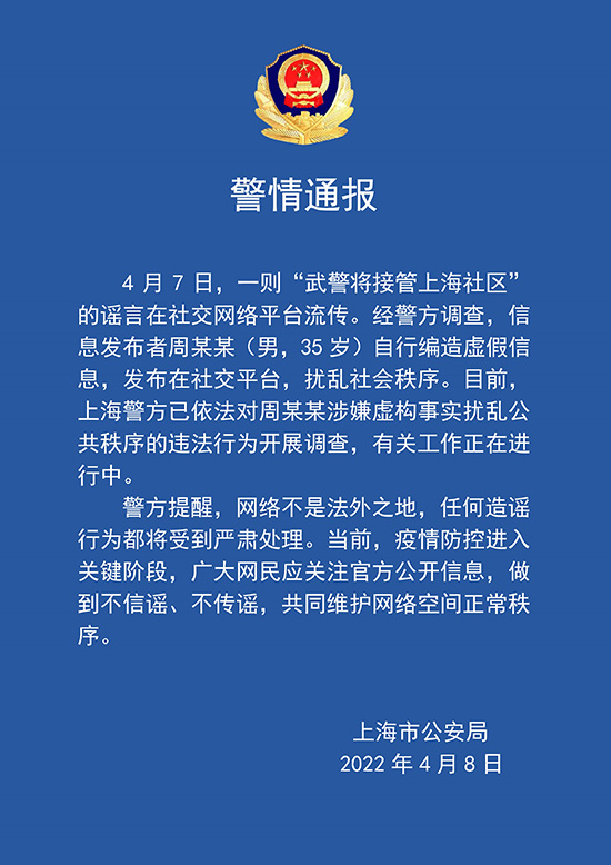 人民網(wǎng)上海4月8日電(王文娟)據(jù)上海市公安局通報:4月7日,一則“武警將接管上海社區(qū)”的謠言在社交網(wǎng)絡(luò)平臺流傳。經(jīng)警方調(diào)查,信息發(fā)布者周某某(男,35歲)自行編造虛假信息,發(fā)布在社交平臺,擾亂社會秩序。目前,上海警方已依法對周某某涉嫌虛構(gòu)事實擾亂公共秩序的違法行為開展調(diào)查,有關(guān)工作正在進(jìn)行中。