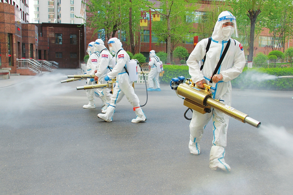 4月12日,在小店區(qū)千禧學(xué)府苑小區(qū),太原市應(yīng)急管理綜合行政執(zhí)法支隊(duì)的消殺隊(duì)員們正在消殺。隨后他們來到西吳村社區(qū)、丁香園、恒大綠洲、長風(fēng)小區(qū)等居民住宅區(qū),對(duì)所有樓棟、垃圾點(diǎn)及室外公共區(qū)域等進(jìn)行全面消殺,牢牢筑起健康防線。(記者尤麗云攝)