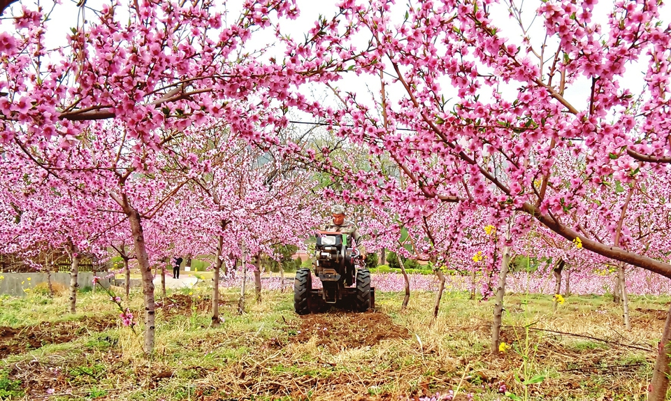 4月12日,左權(quán)縣上武村百畝桃園花開太行,農(nóng)民正在使用拖拉機松土施肥耕作管護。上武村地處太行百里畫廊的核心區(qū)域,近年來,該村積極推動農(nóng)旅融合,發(fā)展生態(tài)旅游,每到春天,連片的桃花競相綻放、美如云霞,構(gòu)成一幅太行田園風光圖,吸引了游客踏青賞春,促進了產(chǎn)業(yè)發(fā)展農(nóng)民增收。(邢蘭富攝)