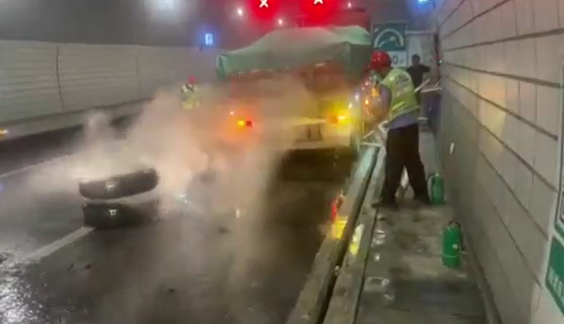 22點3分,巡查員通過對向隧道的汽通門第一時間進(jìn)入現(xiàn)場,施救人員從同向到達(dá)現(xiàn)場,一次“雙向奔赴”的救火就此展開。一名巡查員與施救人員緊密配合,拿出水槍,對著起火點進(jìn)行滅火。不出2分鐘,起火點的明火被熄滅,但是溫度還是很高,需要不斷澆水才能阻止輪胎復(fù)燃。另一名巡查員則將司機帶離到安全地帶,隨后又將車道上的雜物清理至緊急停車帶,以便解除卡口后為后續(xù)車輛提供一個安全的行車環(huán)境。22點23分,車道恢復(fù)暢通。