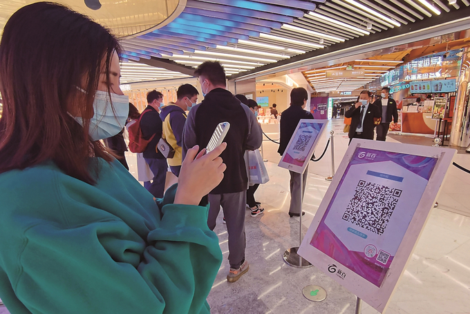 昨日,記者在南京新街口一大型購物中心入口處看到,印有“場所碼”的告示牌非常醒目,工作人員提醒市民進(jìn)入需掃描場所碼。 本報記者 宋寧 攝