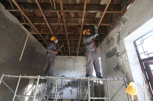 按照計(jì)劃,樓頂將由原來(lái)的木質(zhì)大屋脊整體更換為樹脂瓦阻燃屋面。而在第一階段改造中,樓體阻燃,為居民量身訂制燃?xì)夤?,配?4小時(shí)巡護(hù)“管家”,每天進(jìn)行巡查記錄并拍攝現(xiàn)場(chǎng)照片均已完成。一層的臨街房屋內(nèi)的夾層已經(jīng)拆除完畢,木制窗已經(jīng)更換為塑鋼窗,原來(lái)的薄墻面上加裝硅酸鈣板,地面鋪設(shè)了耐火地板磚,屋頂?shù)跹b了石膏板。二層樓內(nèi)木樓板已鋪設(shè)耐火瓷磚,樓內(nèi)電線電纜進(jìn)行了梳理排查,完成了整體更換,鋪設(shè)了不銹鋼槽式電纜橋架,確保樓內(nèi)居民用電安全穩(wěn)定。