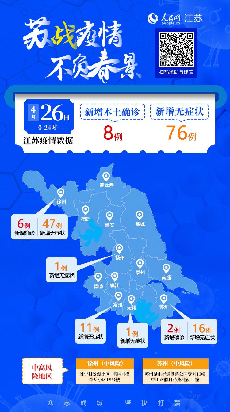 4月26日江蘇新增本土確診病例8例 本土無癥狀感染者76例