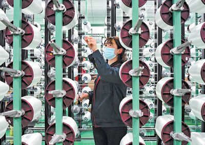 江西省贛州市上猶縣新材料科創(chuàng)產(chǎn)業(yè)園,工人在加工生產(chǎn)電子級玻纖復(fù)合材料。