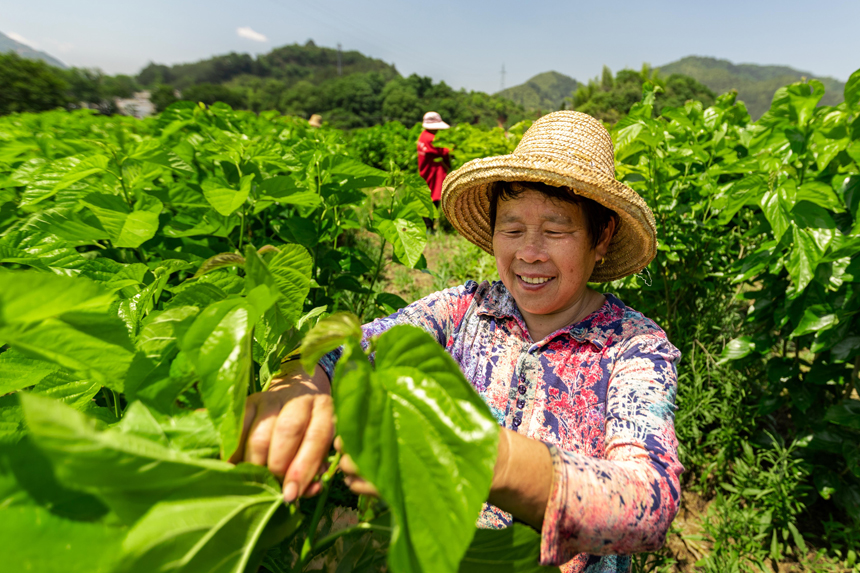 在澧田鎮(zhèn)雙江村蠶?;?,蠶農(nóng)在采摘桑葉。朱國朝攝