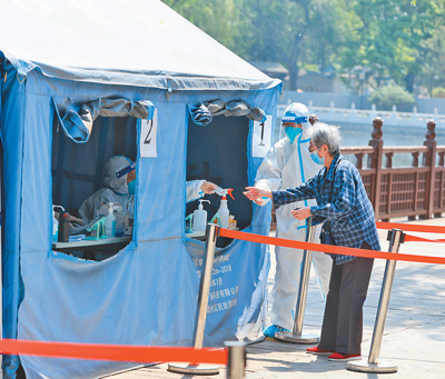 5月4日,北京西城區(qū)什剎海街道荷花市場核酸檢測現(xiàn)場,工作人員引導老人通過綠色通道進行核酸檢測。什剎海街道優(yōu)化點位設(shè)置,減少排隊時間。同時特別關(guān)注老人、兒童等群體,為他們開辟綠色通道,進一步提高采樣工作效率。