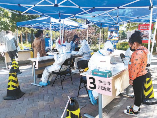 昨天,石景山區(qū)古城街道燕堤中街社區(qū)核酸檢測點設有學生檢測專用通道,方便學生隨來隨檢,不耽誤上網(wǎng)課。本報記者 吳鏑攝