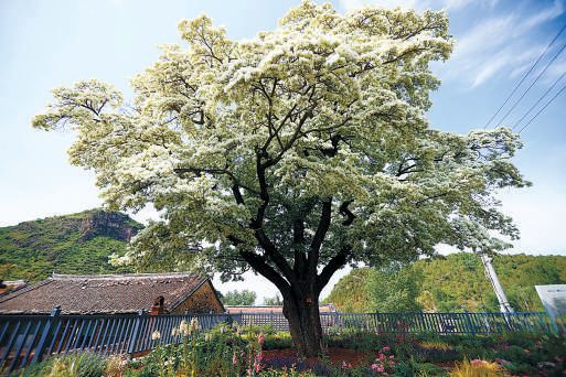 本報訊(記者 王可心)日前,密云區(qū)新城子鎮(zhèn)蘇家峪村一株古流蘇樹進入盛花期,作為北京市屈指可數(shù)的古流蘇樹,不僅因花枝觀賞性強受到民眾喜愛,更因其歷史價值而被廣泛關(guān)注。據(jù)了解,流蘇樹系北京市二級保護野生植物?!拔覀兇暹@株流蘇樹是一級古樹,據(jù)專家推斷,至今已有近600年歷史?!碧K家峪村黨支部書記王銀江介紹,該樹高約13米,主干到1.3米處分為兩主枝,向上延展成蘑菇形樹冠,平均冠幅約16米?;ㄆ陂_滿潔白的流蘇花,遠觀如覆霜蓋雪,流蘇細穗隨風(fēng)搖曳,清香怡人。供圖/密云區(qū)委宣傳部