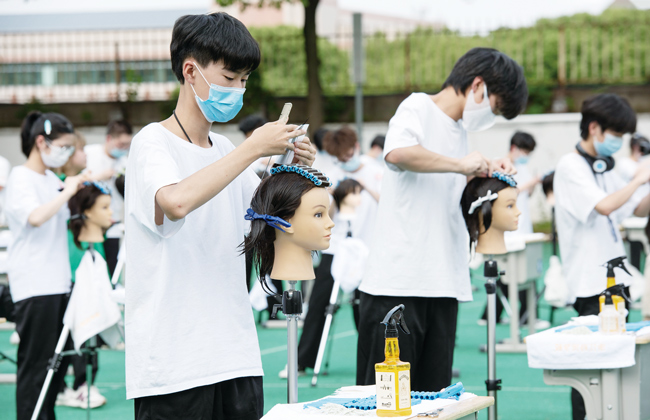 5月17日下午,金華電大(浙江貿(mào)易學(xué)校)舉辦2022年技能文化節(jié),該校美容美發(fā)與造型、烹飪、建筑、數(shù)字影像專業(yè)400多名學(xué)生,在學(xué)校操場上進(jìn)行職業(yè)技能展示比武,檢驗(yàn)所學(xué)專業(yè)水平。(時(shí)寬兵)