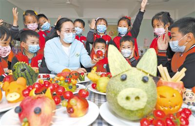 5月20日是“中國學生營養(yǎng)日”。近日,山東省東營市東營區(qū)一家幼兒園里,師生把五顏六色的水果、蔬菜制作成各種造型,并在制作過程中了解各種水果、蔬菜的營養(yǎng)價值,引導孩子們不挑食、不偏食,拒絕浪費,樹立健康飲食觀念。