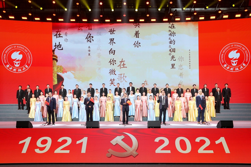 南科大校長(zhǎng)薛其坤與院士代表、師生代表齊唱《共和國(guó)之戀》。南科大供圖