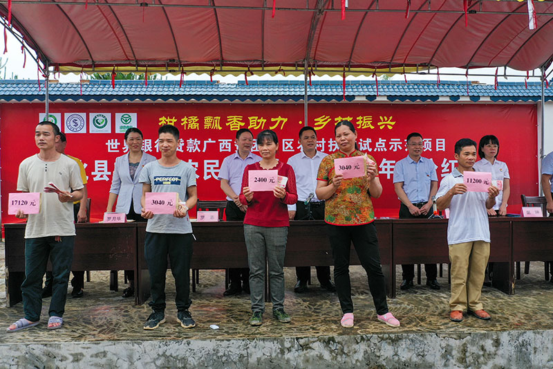 正在布置分紅現(xiàn)場的東皇嶺農(nóng)民專業(yè)合作社理事長覃順從說:“世行項目大化縣東皇嶺農(nóng)民專業(yè)合作社今天召開2021年年度分紅大會,給175戶入股社員發(fā)放80萬元分紅,下一步我們將和世行項目深入合作,擴(kuò)大我們的農(nóng)業(yè)產(chǎn)業(yè)基地,實現(xiàn)鄉(xiāng)村振興農(nóng)民增收的雙贏目標(biāo)?!?/p>