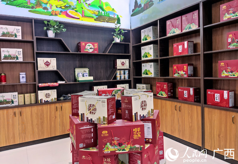 桂平市農(nóng)村產(chǎn)權(quán)流轉(zhuǎn)交易中心內(nèi)的桂平特產(chǎn)展示。人民網(wǎng)記者 王勇攝