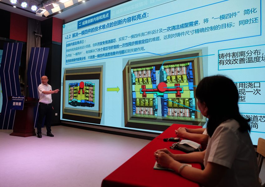 綠色生態(tài)座艙開發(fā)研究技術(shù)成果、變壓器套管換油裝置、高效率的一模四件發(fā)動(dòng)機(jī)缸體毛坯關(guān)鍵技術(shù)研究及成果轉(zhuǎn)化應(yīng)用、新能源退役動(dòng)力電池在SGMW制造系統(tǒng)梯次利用項(xiàng)目、重卷機(jī)組關(guān)鍵設(shè)備減時(shí)操作法……參加決賽的項(xiàng)目成果完成人采用PPT講解和現(xiàn)場(chǎng)答辯相結(jié)合的形式進(jìn)行對(duì)決。項(xiàng)目答辯人就項(xiàng)目立項(xiàng)背景、成果創(chuàng)新內(nèi)容和亮點(diǎn)、成果采納實(shí)施情況、經(jīng)濟(jì)效益、社會(huì)效益、獲獎(jiǎng)情況等進(jìn)行了介紹,并圍繞創(chuàng)新成果的創(chuàng)新性、原創(chuàng)性、成果應(yīng)用成熟性、質(zhì)量可靠性、成果的先進(jìn)程度、成果技術(shù)水平和難易程度、成果提高勞動(dòng)生產(chǎn)效率作用、經(jīng)濟(jì)效益、社會(huì)效益、成果的適用范圍和推廣前景等方面回答評(píng)委的提問。