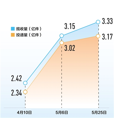 4月10日以來(lái),各地各部門(mén)多措并舉保通保暢,全國(guó)停運(yùn)的郵政快遞分撥中心和郵件快件積壓數(shù)均大幅下降。5月6日,全國(guó)郵件快件攬收、投遞量均恢復(fù)至3億件以上;5月28日,郵件快件攬收量約為3.14億件,投遞量約為3.22億件,均超過(guò)去年同期水平。