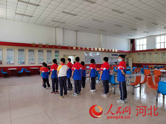 石家莊市少年兒童保護(hù)教育中心的孩子們?cè)谂抨?duì)吃午飯。 人民網(wǎng) 祝龍超攝