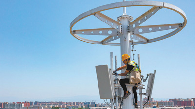 山西省運城市加快發(fā)展數(shù)字經(jīng)濟,加大5G網(wǎng)絡(luò)投資建設(shè)力度。圖為技術(shù)人員在運城市紅盾花園南5G基站點安裝調(diào)試設(shè)備。