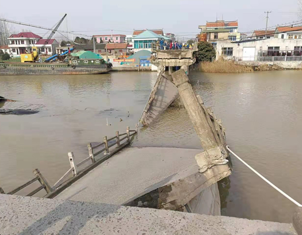 橫跨九圩港河的英雄大橋是劉橋鎮(zhèn)群眾出行的重要通道。2021年1月5日,大橋遭貨船撞擊后垮塌,給九圩港河兩岸村民出行帶來不便。此后,當(dāng)?shù)厝罕娺^河不得不繞行,近的繞行四五公里,遠的十來公里?!昂⒆觽兠刻焐蠈W(xué)放學(xué)都要繞行,遇到惡劣天氣尤為不便。”蔣一村村民陸漢林說,大家都盼著重建大橋。