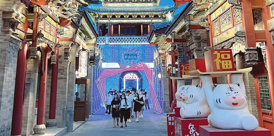 華燈初上,鐘樓街迎來(lái)了不少遛彎的人。鐘樓的鈴鐺在風(fēng)中搖曳,墻體上的燈光秀吸引眾人駐足;小朋友在布老虎雕塑前玩?zhèn)€不停,媽媽忙著拍照留念;穿漢服的少女與拍民國(guó)風(fēng)婚紗照的夫妻撞個(gè)滿懷,讓人宛若坐上時(shí)光機(jī),在歷史和現(xiàn)實(shí)中來(lái)回穿梭。