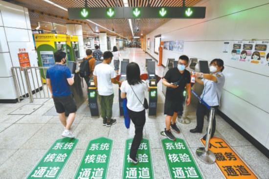 昨天,在地鐵十里河站,乘客從恢復(fù)開(kāi)放的出入口進(jìn)出站,工作人員在閘機(jī)位置幫助還沒(méi)升級(jí)一卡通的乘客進(jìn)行升級(jí)。 本報(bào)記者 鄧偉攝