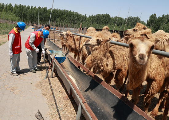5月31日,國家電網冀北電力唐山“鋼鐵之魂”共產黨員服務隊隊員來到駱駝專業(yè)合作社檢查用電設備。 周宇翔攝