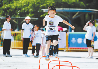 5月29日,小朋友在中國(guó)少兒田徑月·廈門少兒趣味田徑運(yùn)動(dòng)會(huì)上跨越障礙。